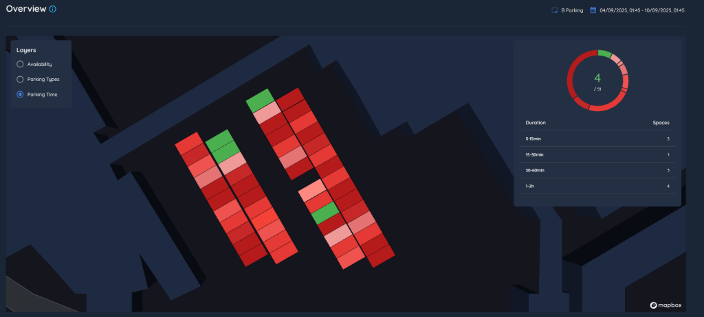 Chaque événement de stationnement est mesuré de l'arrivée au départ, afin que les opérateurs puissent voir combien de temps les véhicules restent, identifier les dépassements de temps et comprendre l'efficacité avec laquelle les espaces sont utilisés.